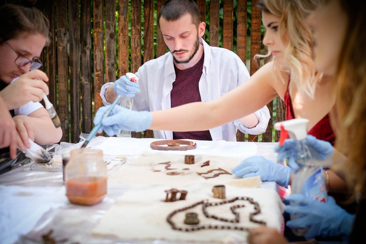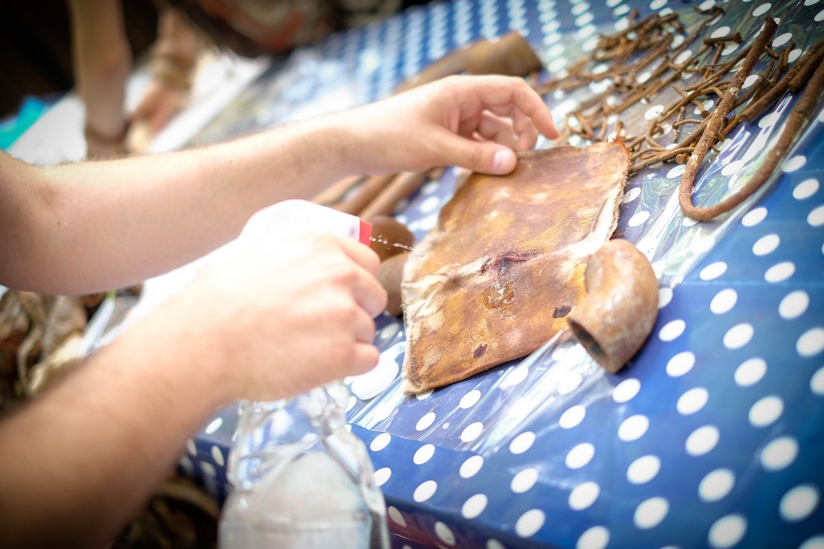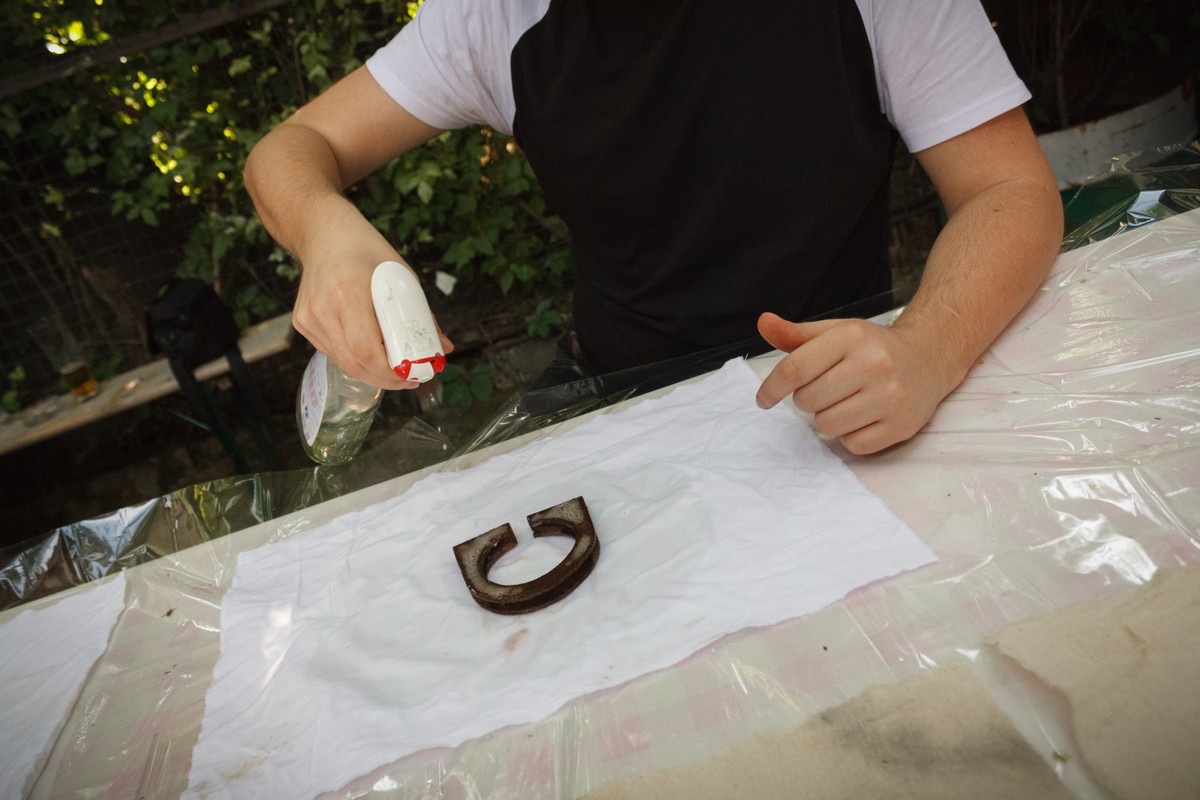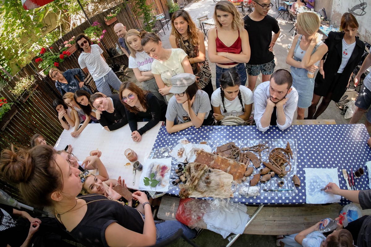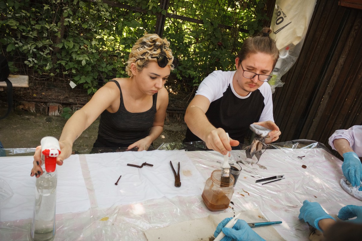 Учесници радионице су пратили процес отискивања зарђалих предмета на текстилним материјалима, као и могућности дигиталне манипулације скенираним отисцима.