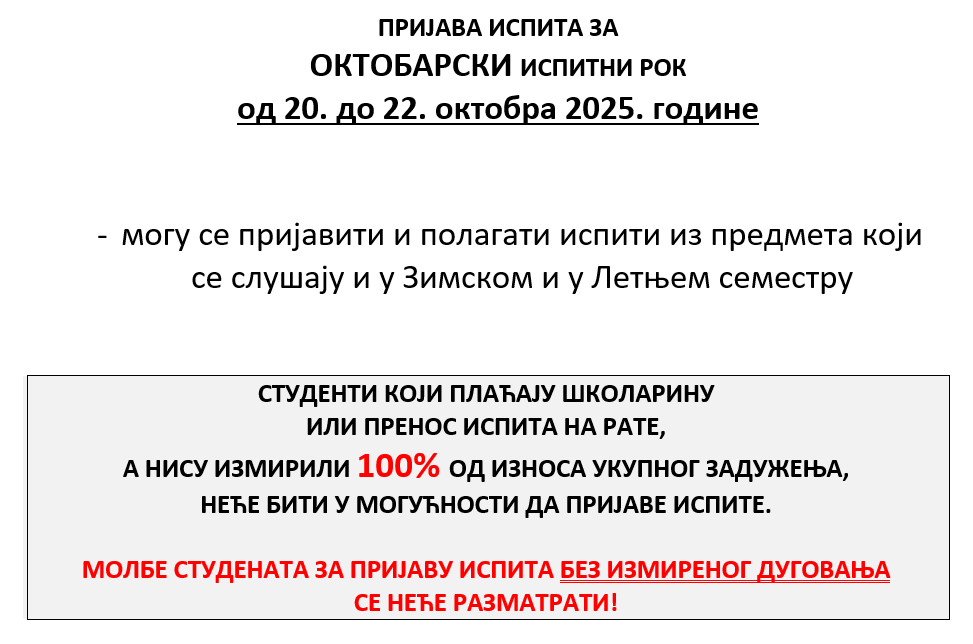 Студенти који плаћају школарину, пренос испита или пријаву испита, уплату могу извршити најкасније три радна дана пред задњи дан за пријаву испита, односно, уплату могу извршити најкасније у понедељак, 20.10.2025. године. Све уплате након тога неће бити прокњижене до последњег дана за пријаву испита па пријава неће бити могућа!
